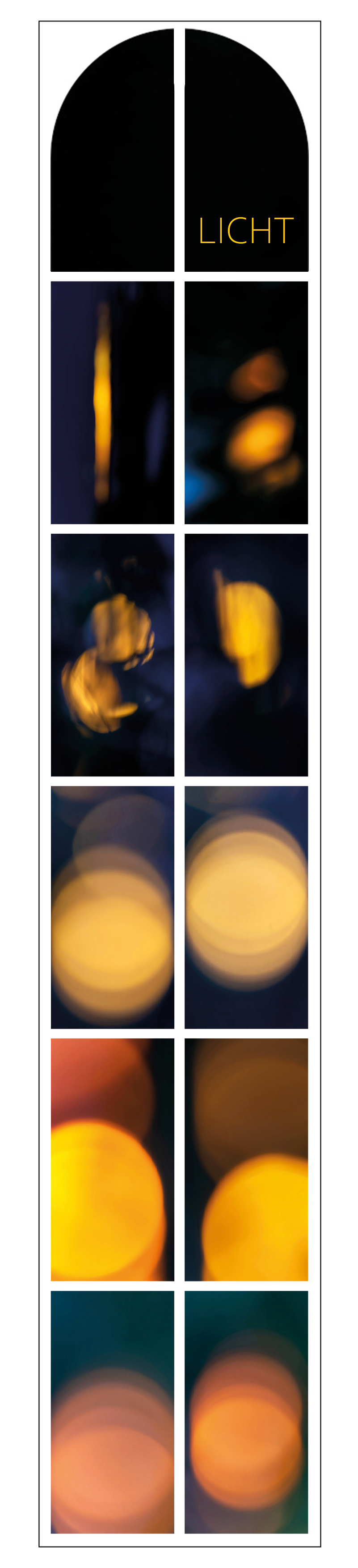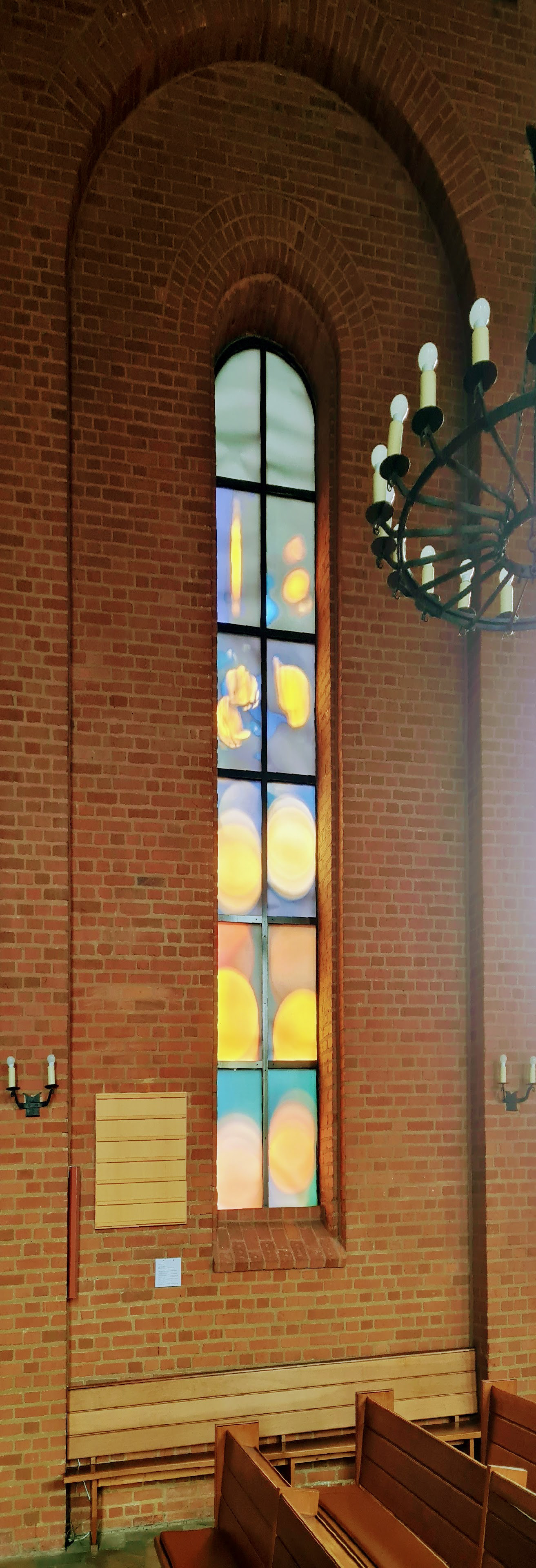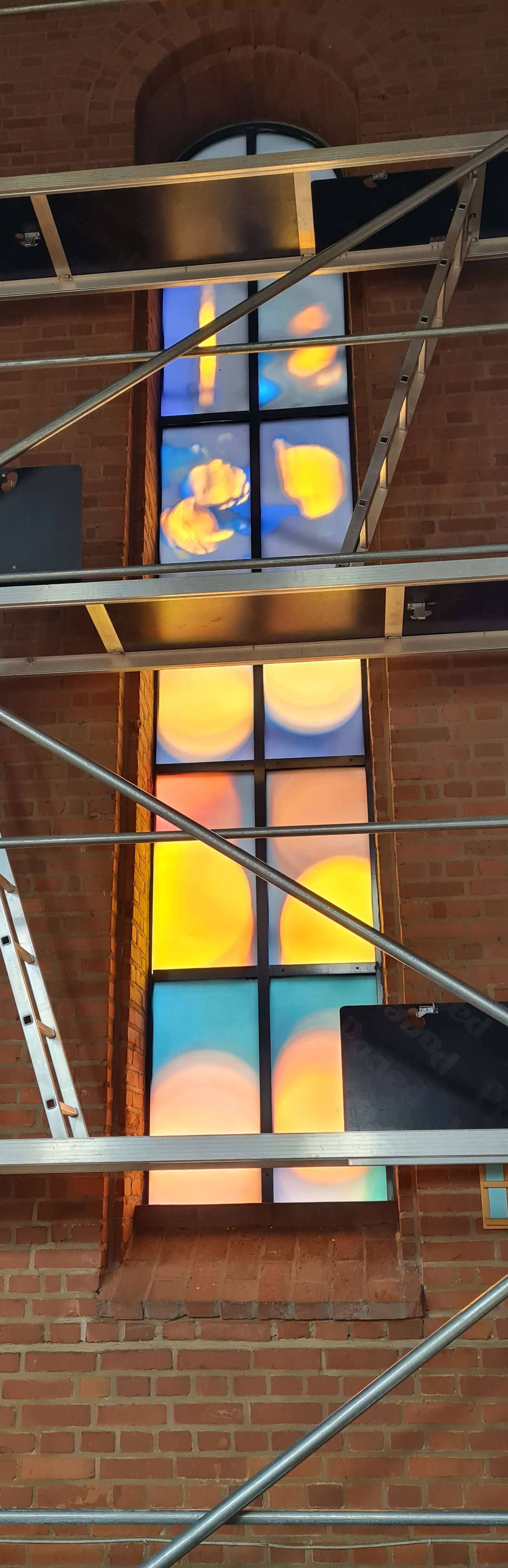 Weitergedacht zUM tHEMA lICHT HABE ICH mit Fotografien ZWEI GEGENÜBERLIEGENDE sechs Meterhohe kIRCHENFENSTER MIT bLACKLIGHTFOLIE GESTALTET. Der Aufbau mit Gerüst war sehr spannend. Die Folien durften auch nach der Ausstellung hängen bleiben.