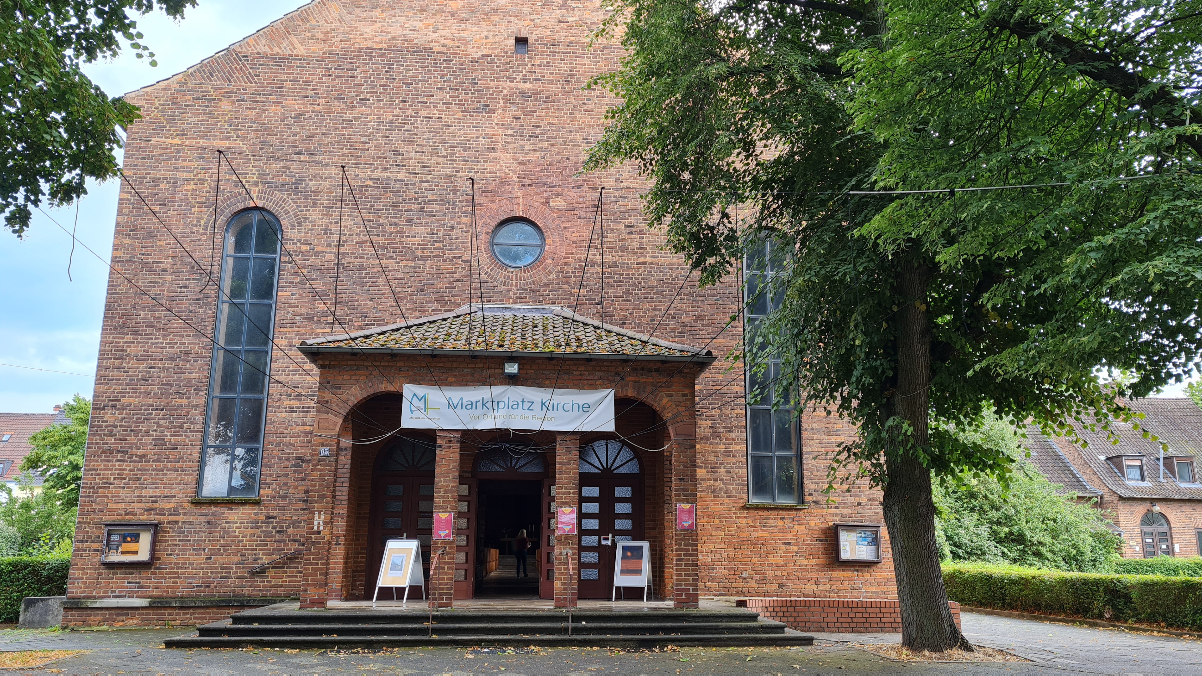 Für meine zweite Arbeit habe ich über dem Eingangsbereich der Kirche Seile gezogen, die sich von einem Knotenpunkt über der Tür nach aussen verteilen um das Thema WEITERdenken aufzugreifen.